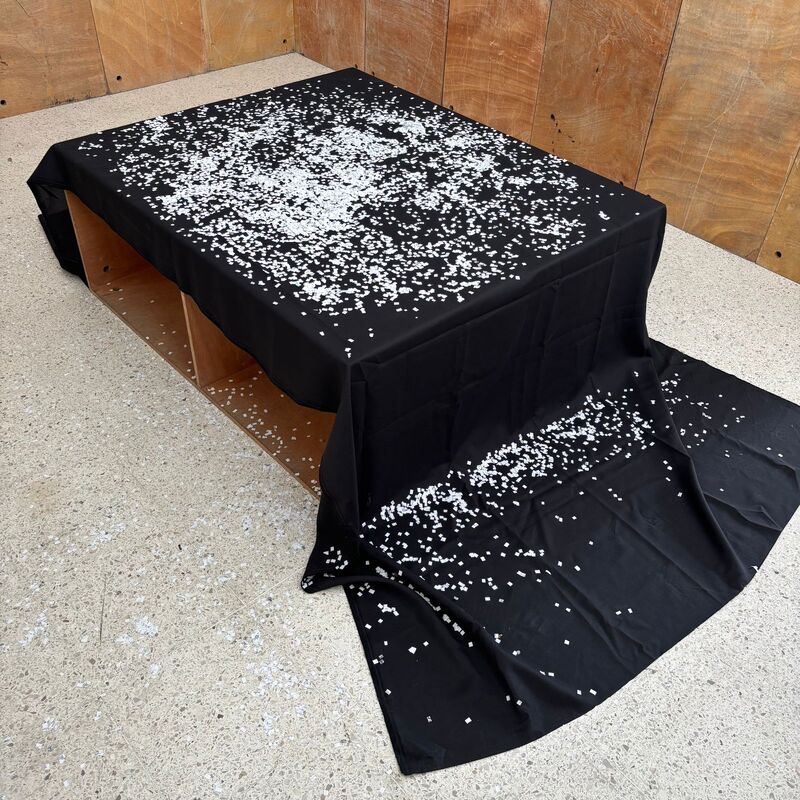 A través del método Iconográfico de Panofski analizaremos la primera etapa de este proyecto se realizó una instalación consiente en un espacio delimitado que contiene una capa extensa de confeti multicolor, creado mediante la trituración meticulosa de treinta páginas de diarios íntimos. Los fragmentos conservan trazos irregulares de tinta manuscrita visible. La obra invita al espectador a ingresar en este territorio, interactuar con el material, caminar sobre él y experimentar sensorialmente su textura. Como un análisis simbolico de los elementos encontrados en la pieza, tenemos el confeti, que simboliza celebración, festividad y alegría socialmente esperada, estos diarios triturados que representan la intimidad vulnerada, la confesión fragmentada, la trituración, alegoria directa a la destrucción controlada de lo privado, un espacio delimitado, actúa como campo ritual donde se desarrolla esta realidad. La pieza construye una alegoría sobre el mandato social de transformar nuestras vulnerabilidades en algo aparentemente festivo, representando visualmente la positividad tóxica contemporánea. Dentro del significado intrínseco se llega al nivel más profundo de la obra ya que revela la violencia simbólica que ejercen las expectativas sociales. En esta ironia central (confeti hecho de confesiones) sintetiza lo que la sociología denomina la ruptura entre el frente escénico público y el backstage privado. El significado esencial no reside en la festividad aparente, sino en el desgaste emocional de la actuación social constante. La trituración de los diarios materializa el proceso de autocensura y fragmentación del yo que realizamos para ser socialmente aceptados. Al convertir al espectador en un Ciudadanos del anonimato que interactúa lúdicamente con estos vestigios íntimos, la obra lo confronta con su propia complicidad en un sistema que valora más la apariencia de bienestar que la autenticidad emocional. Así, la instalación se crea como crítica al pacto social del silencio, donde lo exhibido (el confeti festivo) constituye, ironicamente, un monumento a todo aquello que debe ser destruido y silenciado (las páginas del diario) para mantener la cohesión de la fachada colectiva.