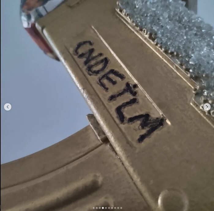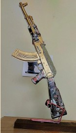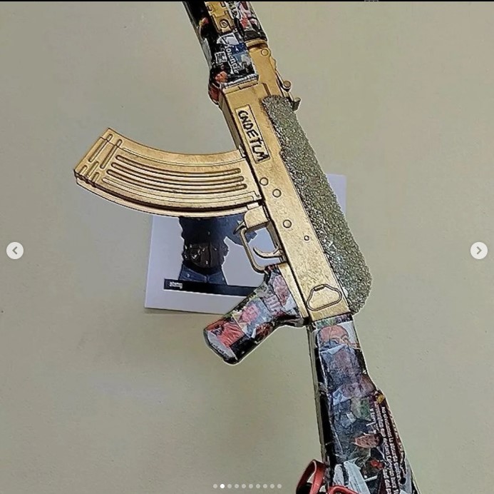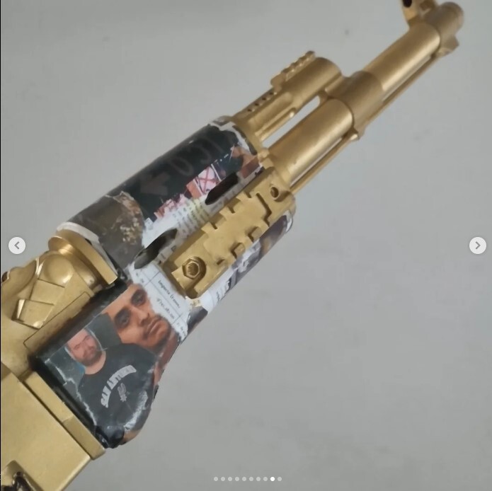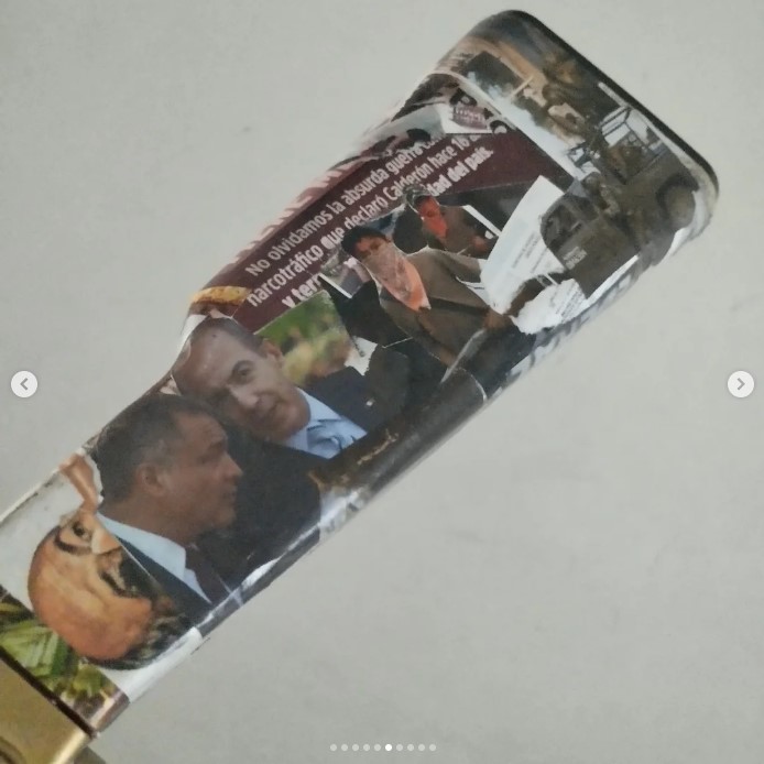 en la que la gente puede asociar más rapido con el narco y el estar pintada en oro y simular los diamantes incrustados quiere dar a entender que no esta nada alejado de la realidad, asi como el uso de las fotografias, imágenes, documentos que cubren la pieza, que quiere dar a entender lo que significa tener un arma de fuego en manos equivocadas, usar la canción de José José